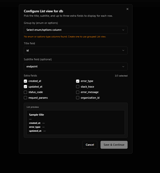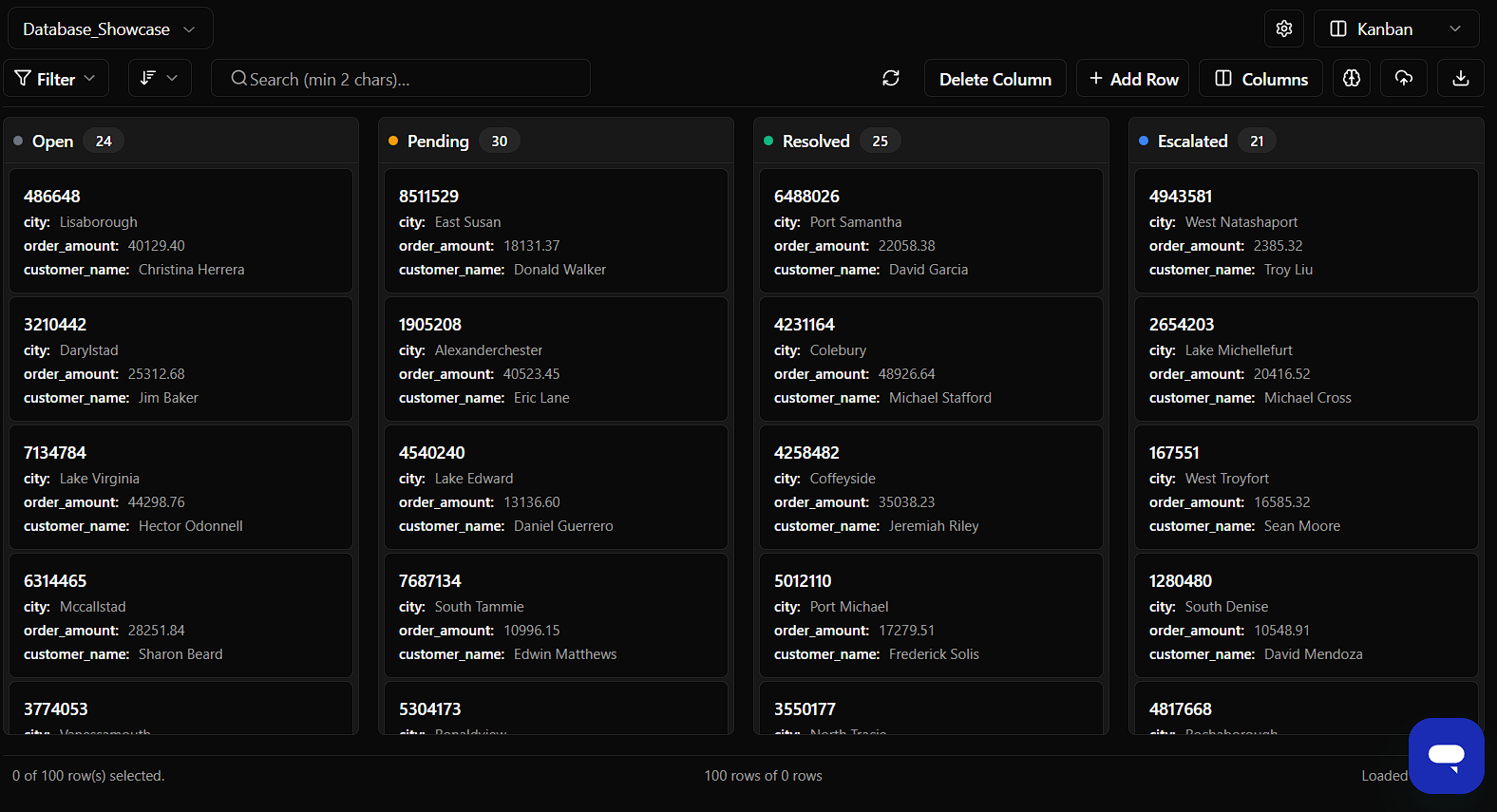 Turns any enum column (like status) into a drag-and-drop board. Perfect when you want to see "where everything is" at a glance.